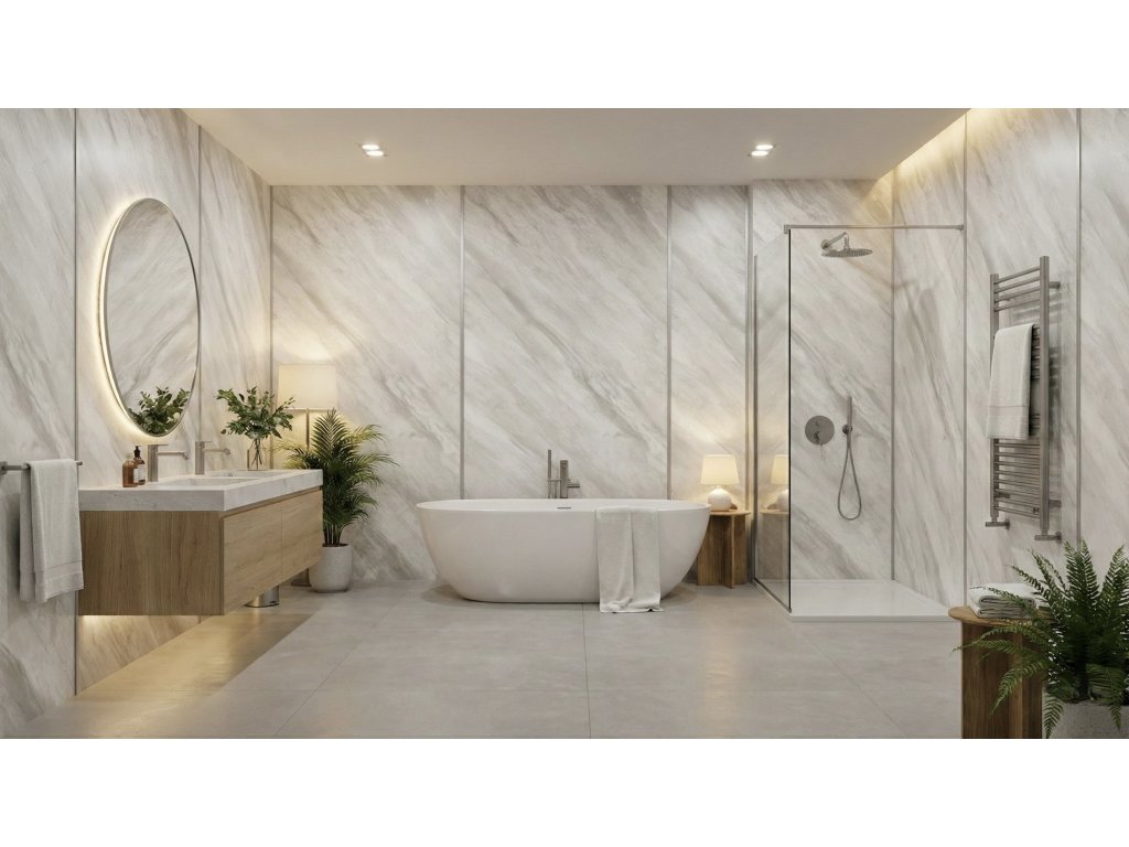 💧 100% Voděodolnost: Voda, pára ani vlhkost panelům neublíží. Jsou perfektní volbou pro sprchové kouty, okolí van nebo toalety. Navíc díky velkém formátu (přes 3 m² v kuse) eliminujete množství spár, kde se běžně tvoří plísně.